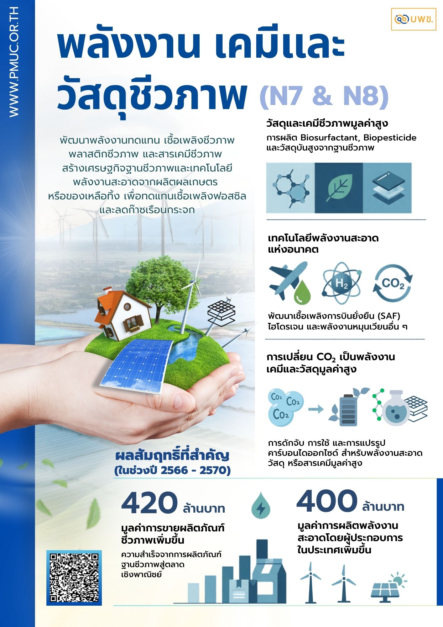 - N7 (S1P4) สร้างเศรษฐกิจฐานชีวภาพ (เชื้อเพลิงชีวภาพ วัสดุและเคมีชีวภาพ) จากการเปลี่ยนผลิตผลทางการเกษตรหรือของเหลือทิ้งในกระบวนการผลิตหรือการบริโภค