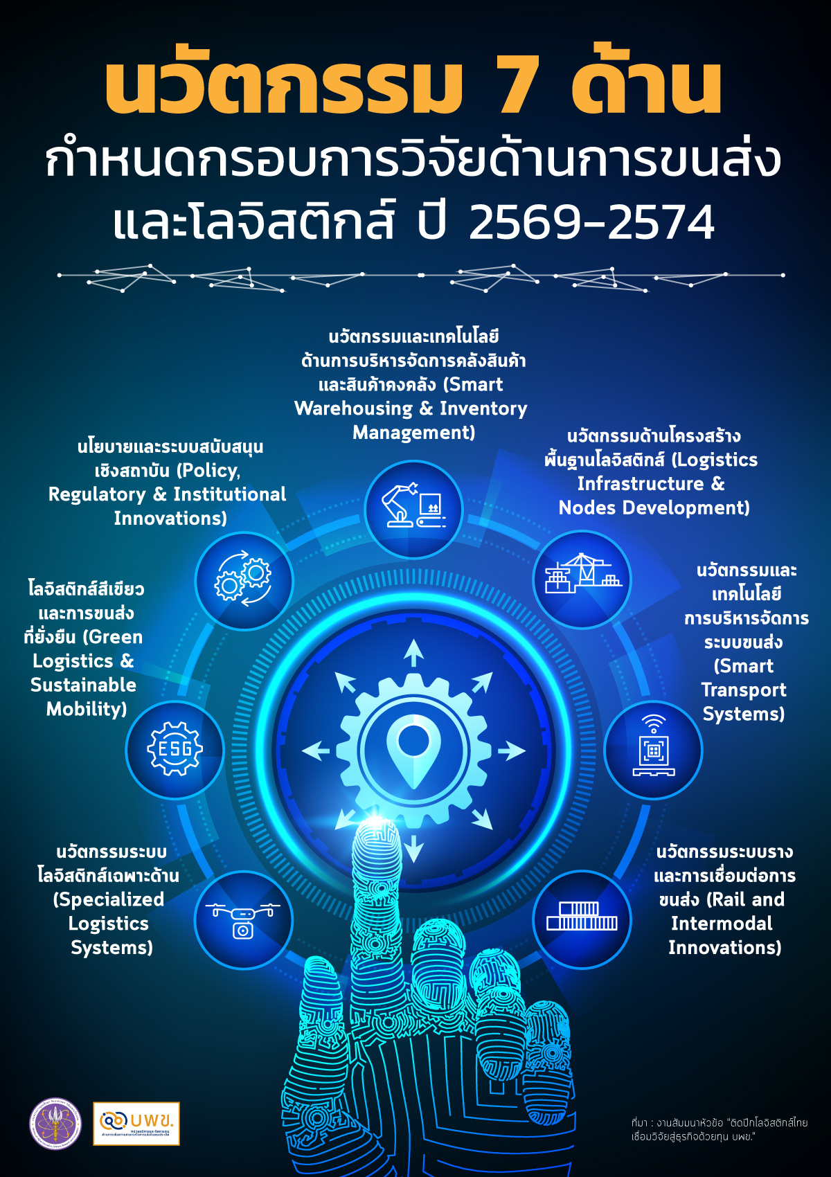 “ส่วนกรอบการวิจัยด้านการขนส่งและโลจิสติกส์ ช่วงปี 2569-2574 ของ บพข. มีเป้าหมายหลักเพื่อยกระดับขีดความสามารถด้านขนส่งและโลจิสติกส์ของประเทศให้สามารถแข่งขันได้ในระดับภูมิภาคและโลก ผ่านการพัฒนาเทคโนโลยี นวัตกรรม และโครงสร้างพื้นฐานที่ยั่งยืน เชื่อมโยงทุกมิติของเศรษฐกิจ สังคม และสิ่งแวดล้อม ซึ่งประกอบด้วย นวัตกรรม 7 ด้าน ได้แก่”