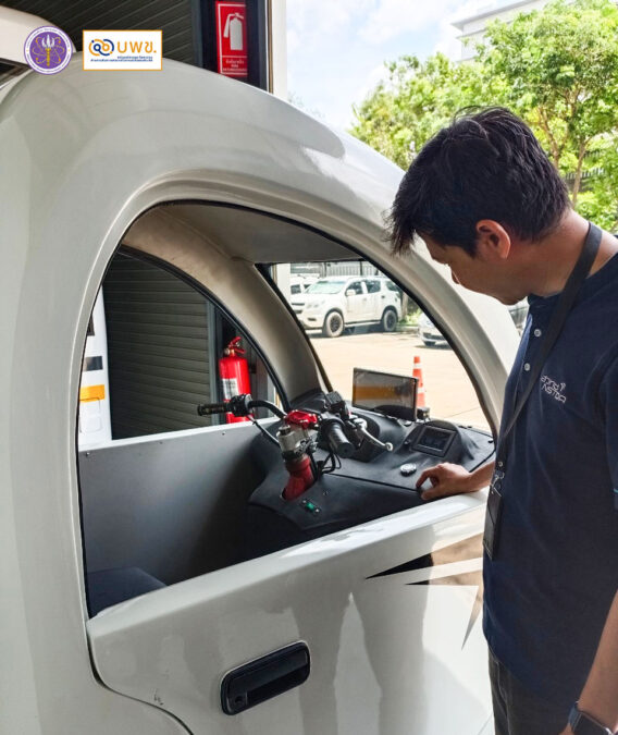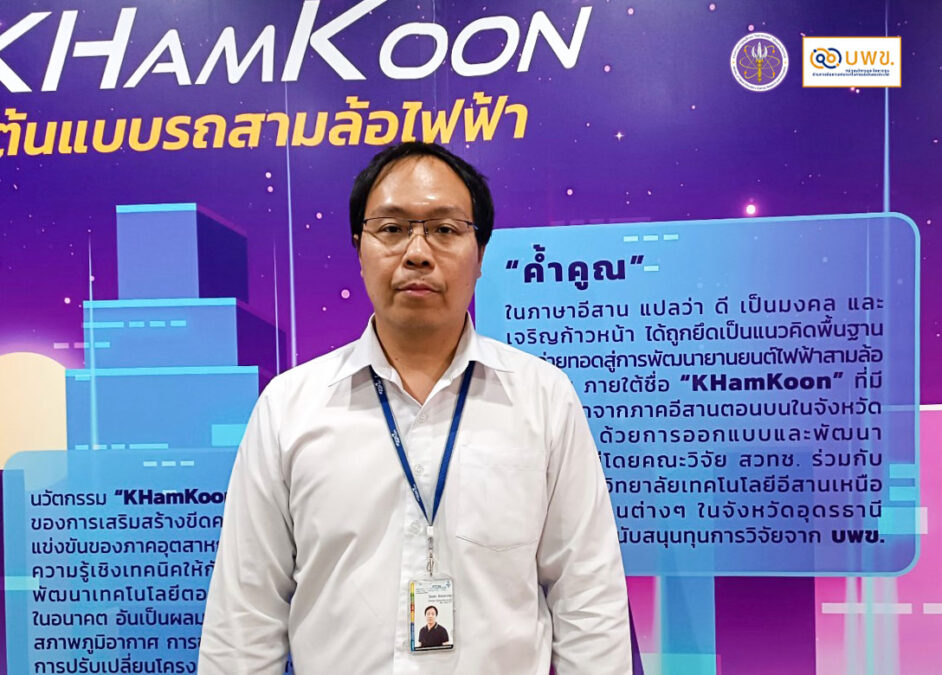 “ในมุมของคนอุดรธานี มีกลยุทธ์ในการพัฒนาเมืองด้วยคีย์เวิร์ดคือ “เมืองเดินได้” หมายถึงคนไม่จำเป็นต้องใช้รถส่วนตัวในการเดินทาง แต่หันมาใช้รถสาธารณะแทน แล้วรถสาธารณะอะไรที่ตอบโจทย์ความเป็นเมืองที่มีขนาดกะทัดรัดเช่นอุดรธานี นั่นก็คือ micro mobility ผนวกกับเรามีโอกาสคุยกับผู้ประกอบการที่ผลิตรถสกายแล็บในอุดรธานี คุยกับสภาอุตสาหกรรมจังหวัดอุดรธานี และ วิทยาลัยเทคโนโลยีอีสานเหนือ ซึ่งให้ความสำคัญกับการพัฒนานวัตกรรม การพัฒนาองค์ความรู้ และเห็นว่าการพัฒนารถสามล้ออีวี KHamKoon จะทำให้นักศึกษาของวิทยาลัยเทคโนโลยีอีสานเหนือ ได้เรียนรู้นวัตกรรมยานยนต์ยุคใหม่ เมื่อได้ภาคเอกชนมาร่วม เราก็ดีไซน์สามล้ออีวี ตั้งแต่การออกแบบ พัฒนาแบบ พัฒนาเทคโนโลยี ทำโปรโตไทป์ จากนั้นจึงเขียนโครงการขอรับการสนับสนุนทุนวิจัยจาก บพข. และได้รับการอนุมัติ โดยเอกชนคือวิทยาลัยเทคโนโลยีอีสานเหนือ ร่วมสนับสนุนทุนวิจัย 10 เปอร์เซ็นต์ พร้อมกับให้ใช้สถานที่ของวิทยาลัยพัฒนาต้นแบบรถสามล้อ KHamKoon” ดร.เอกรัตน์ กล่าว