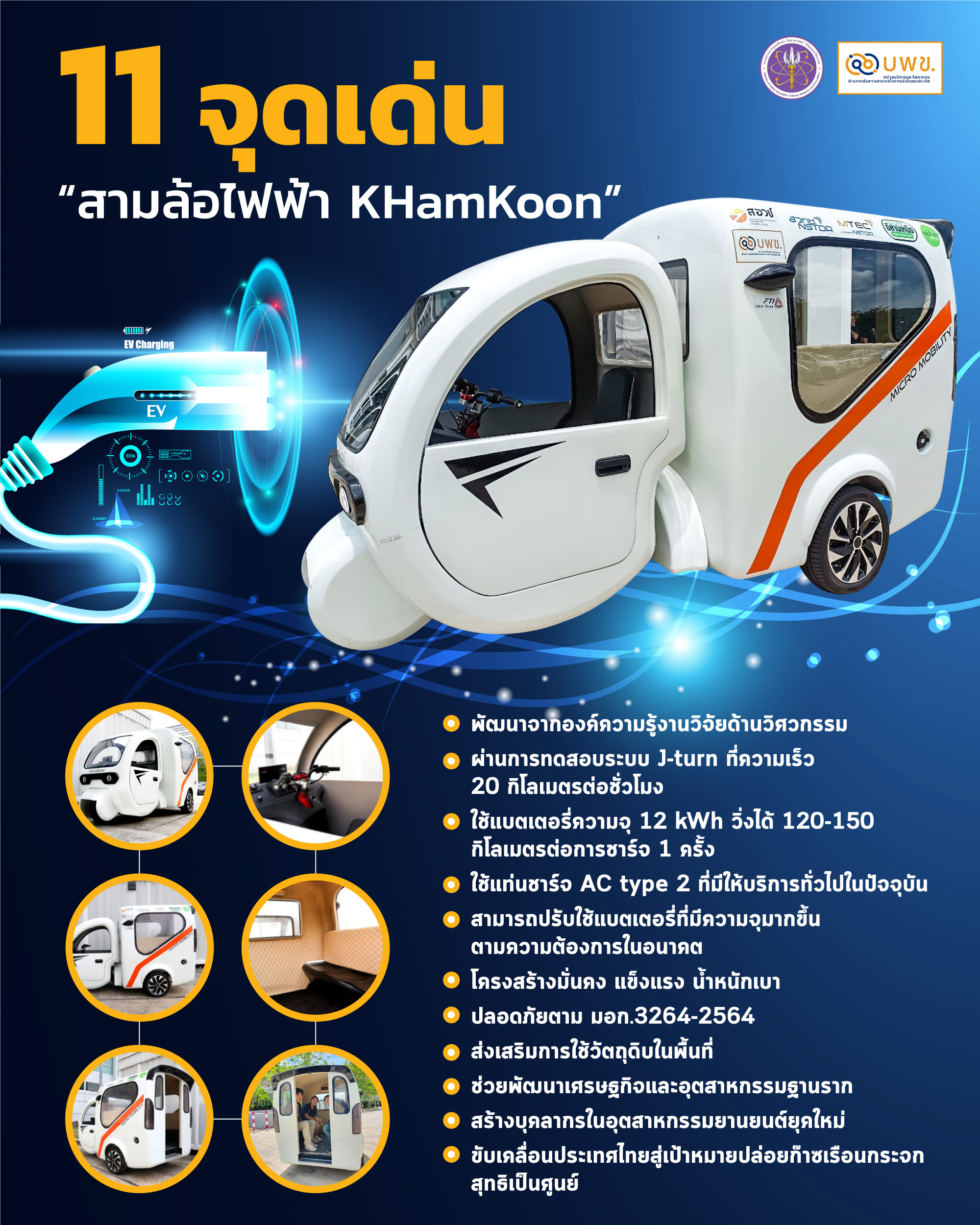 สามล้ออีวี KHamKoon พัฒนาโดย ศูนย์เทคโนโลยีโลหะและวัสดุแห่งชาติ (เอ็มเทค) สำนักงานพัฒนาวิทยาศาสตร์และเทคโนโลยีแห่งชาติ (สวทช.) โดยกลุ่มวิจัยเทคโนโลยีระบบรางและการขนส่งสมัยใหม่ (RMT) ร่วมกับ บริษัท เทคโนโลยีอีสานเหนือ จำกัด โดย วิทยาลัยเทคโนโลยีอีสานเหนือ จังหวัดอุดรธานี ภายใต้การสนับสนุนทุนวิจัยวิจัยจาก หน่วยบริหารและจัดการทุนด้านการเพิ่มความสามารถในการแข่งขันของประเทศ (บพข.) กระทรวงการอุดมศึกษา วิทยาศาสตร์ วิจัยและนวัตกรรม (อว.) ตอบรับพฤติกรรมคนรุ่นใหม่ที่ต้องการความทันสมัย ปลอดภัย และเป็นมิตรกับสิ่งแวดล้อม
